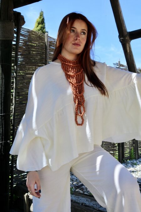 Blusa en tejido de gasa, color beige, manga larga oversize con maxi volantes, cuello redondo, más pantalón en el mismo tejido con cintura engomada, corte recto ancho y largo midi.