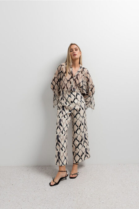 Combina nuestro pantalón estampado con nuestra camisa estampada semitransparente y zapatos de tacón o sandalias y tendrás un total look ideal.