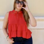 Stock agotadoBlusa roja volantes. Blusa sin manga en color rojo y acabada en dos volantes que aporta textura.
