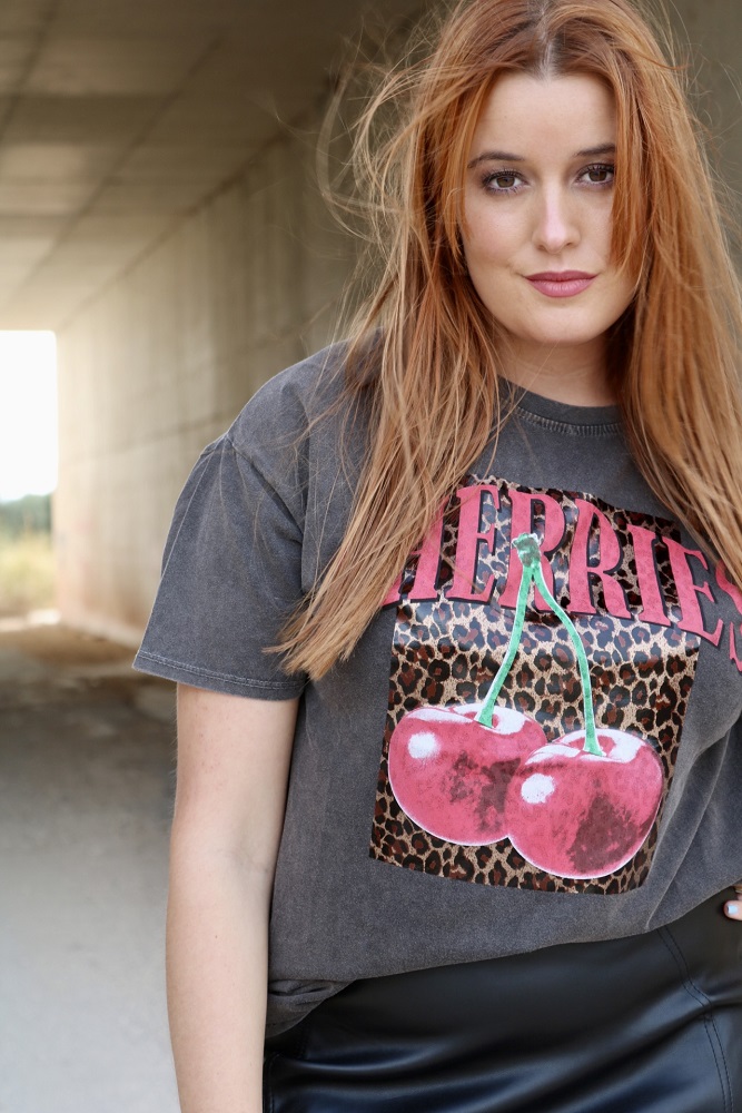 Camiseta de algodón, con escote redondo y estampado de cerezas con un toque de animal print. Cierto es que no es una camiseta blanca fondo de armario, es mejor aún.