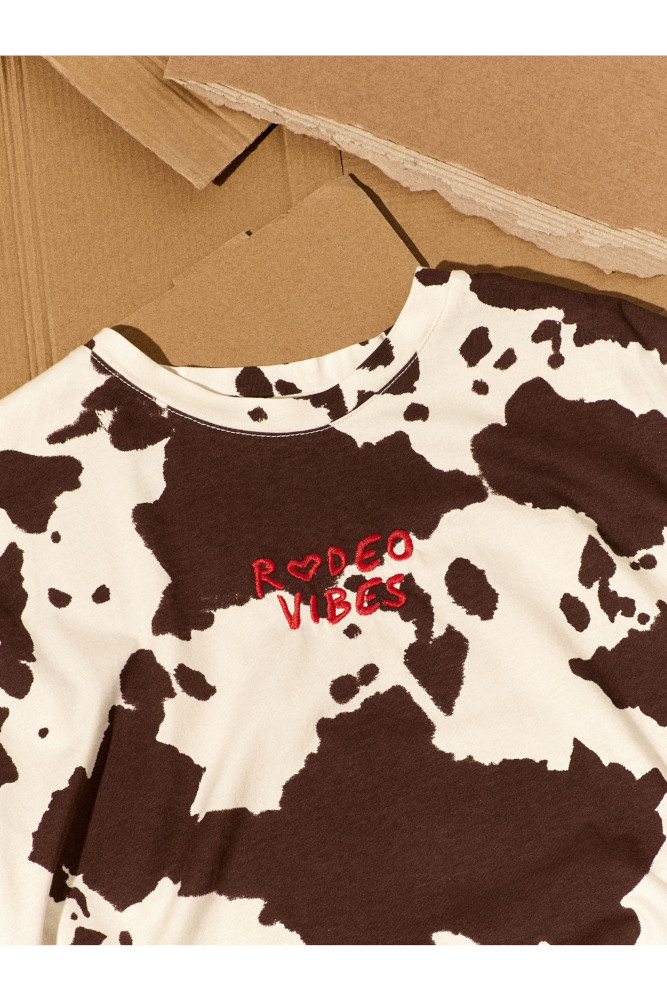 Camiseta de algodón de manga corta, cuello redondo, presenta estampado de vaca y costuras delanteras en rojo.