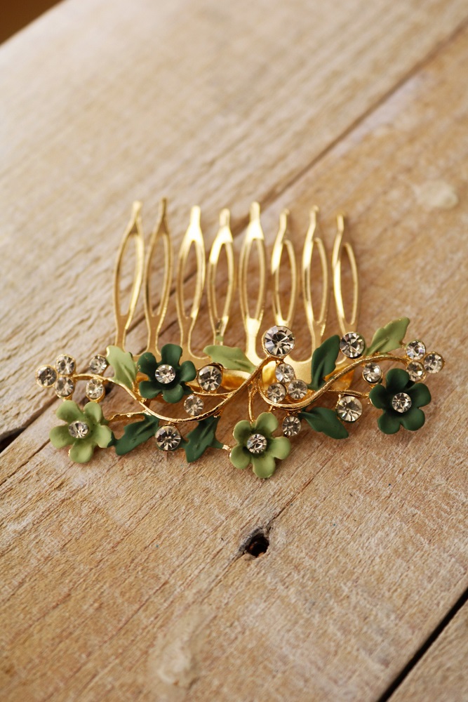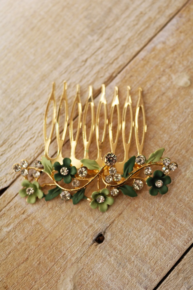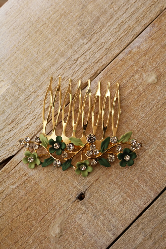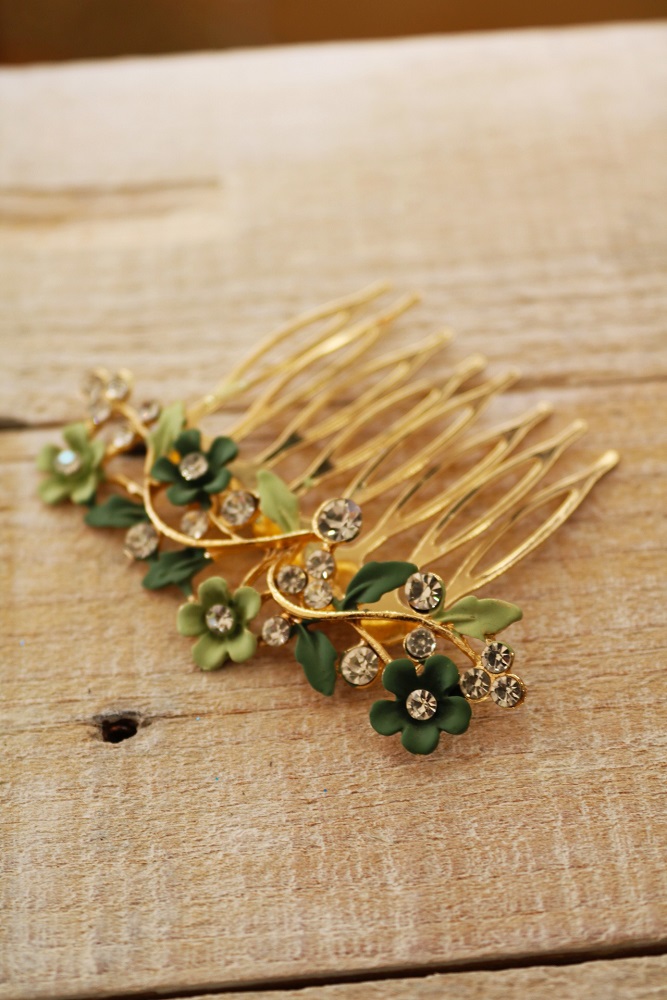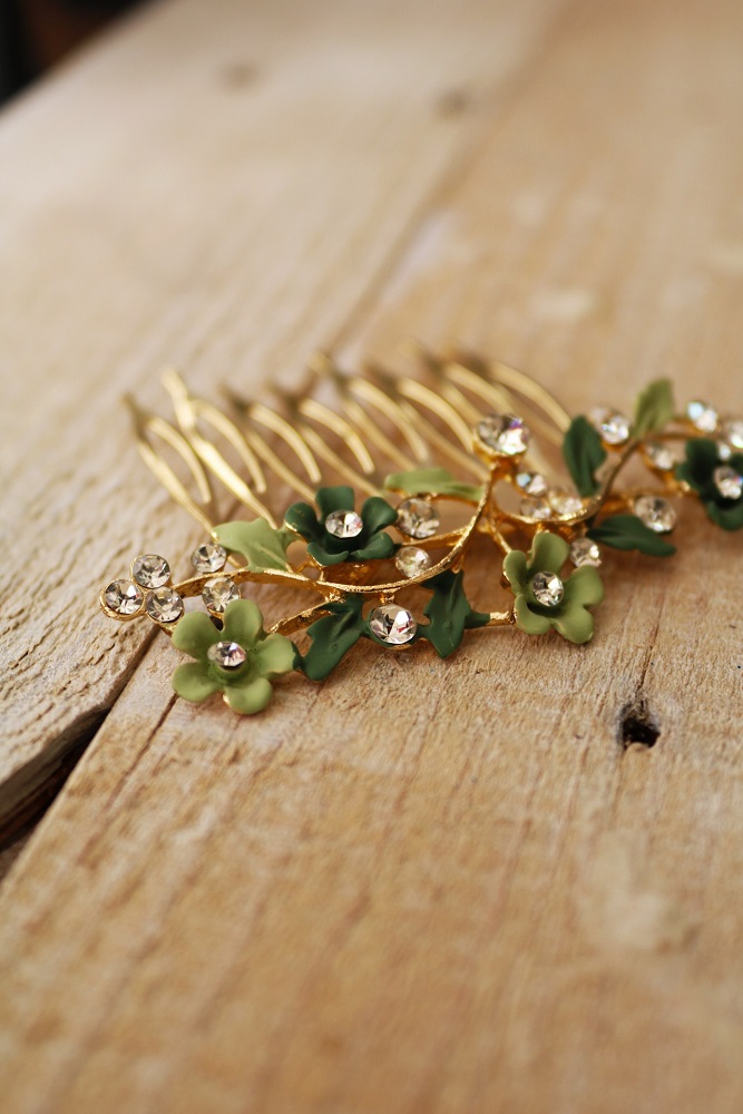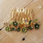 Darle un toque de color y estilo a tu melena para terminar tu look de invitada perfecta es sencillo con nuestras peinas flores verdes.