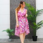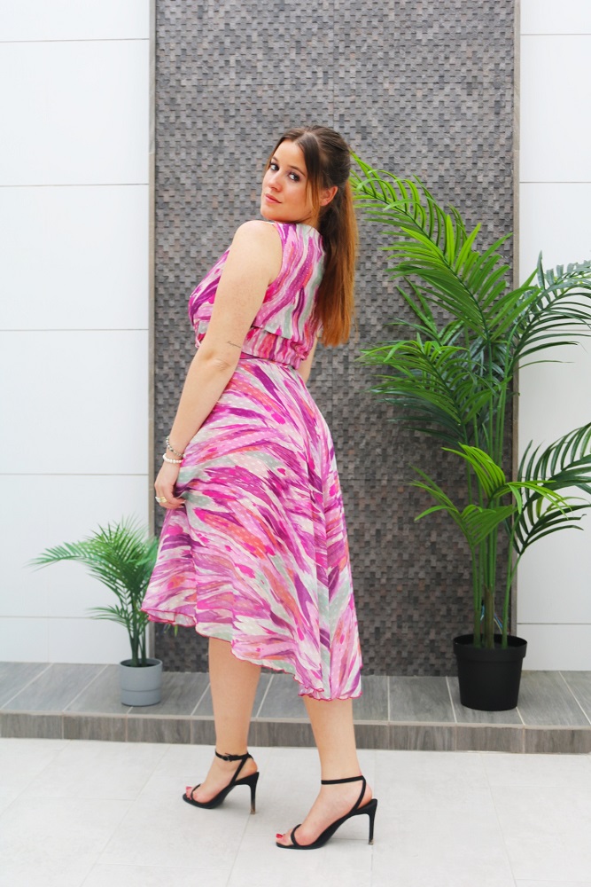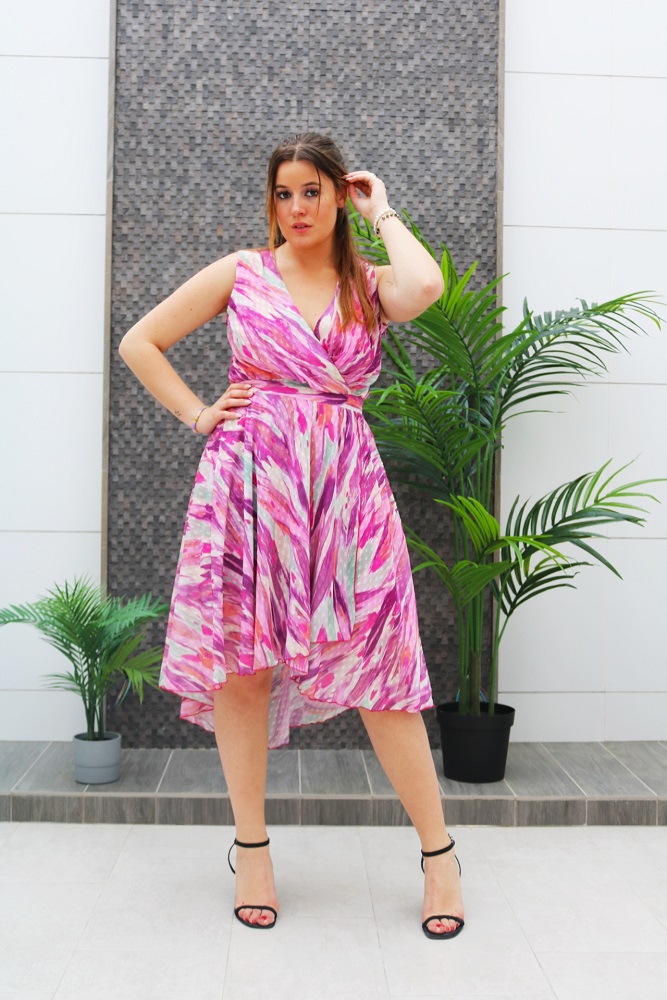 Este vestido con escote en pico cruzado es perfecto para eventos y bodas en esta temporada ya que es muy versátil y lo podrás usar tanto de día,  puesto que tiene un corte perfecto para ello, como de noche, ya que sus colores son geniales para esta ocasión.