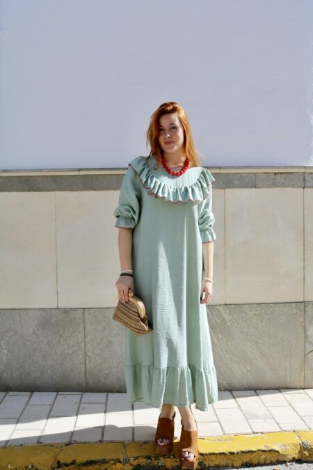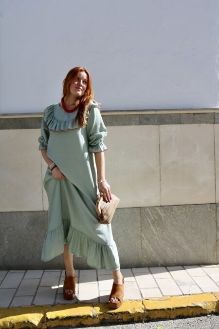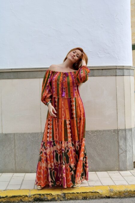 Es de esos vestidos que te pones sin pensar y ya llevas todo el look resuelto, porque habla por sí solo. Perfecto para pasear por mercados artesanales, una cena al aire libre o una tarde entre amigas. Si lo combinas con cuñas o sandalias planas, y unos pendientes dorados, el resultado es redondo. Un vestido con alma viajera que convierte cualquier plan en una historia con estilo.