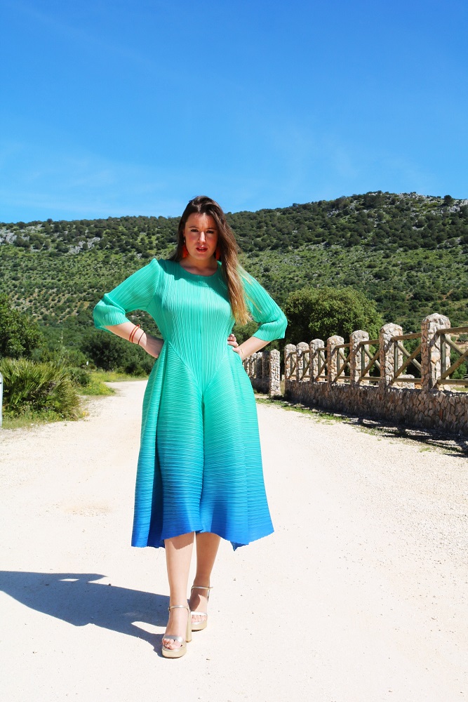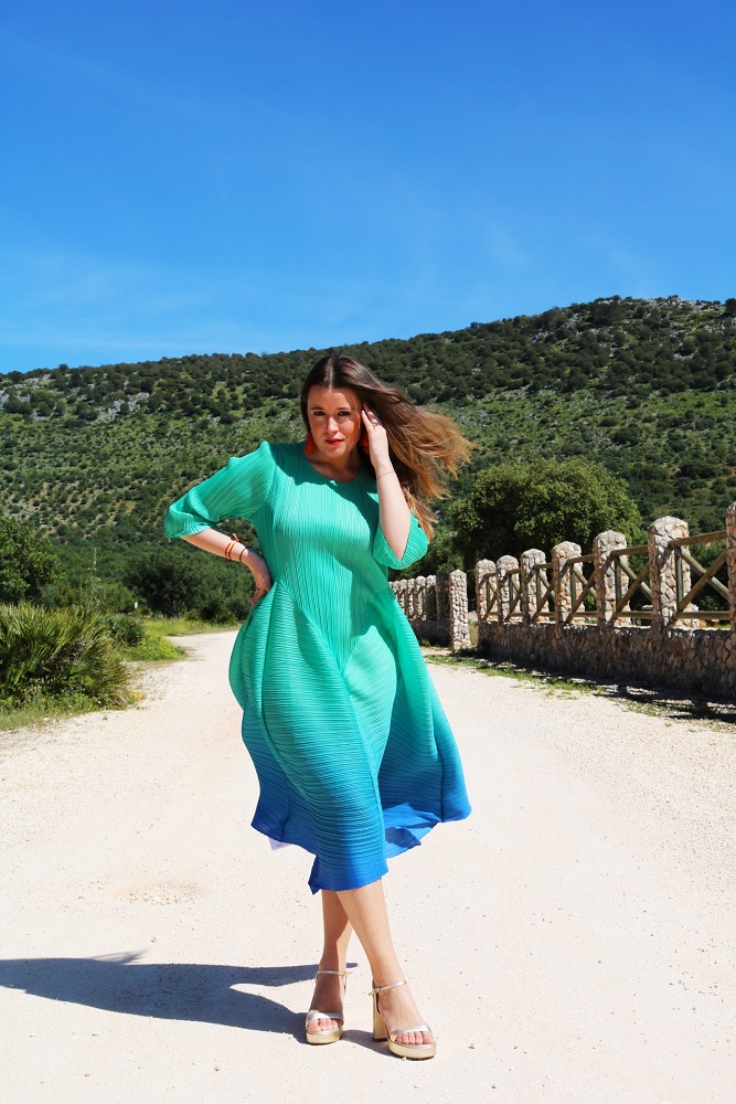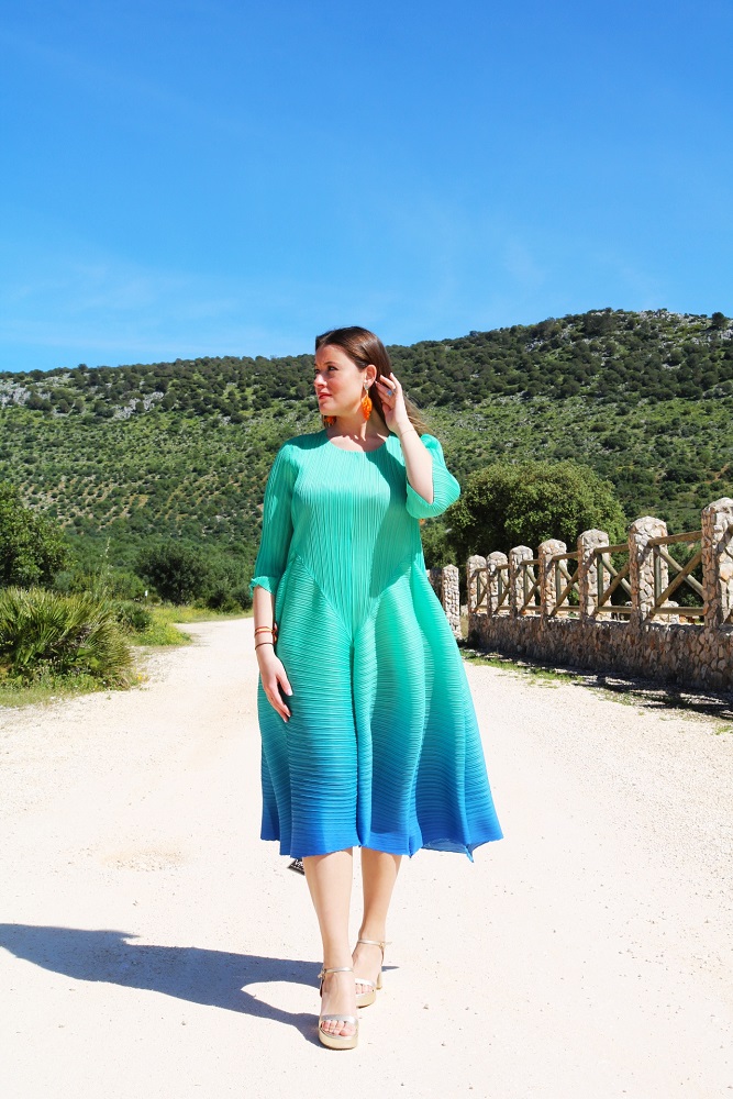 Confeccionado en tejido acordeón y con un degradado de colores espectacular. Este vestido de fiesta es ideal para ocasiones especiales. Gracias a su textura y diseño, no necesita forro interior, ya que no transparenta nada.