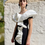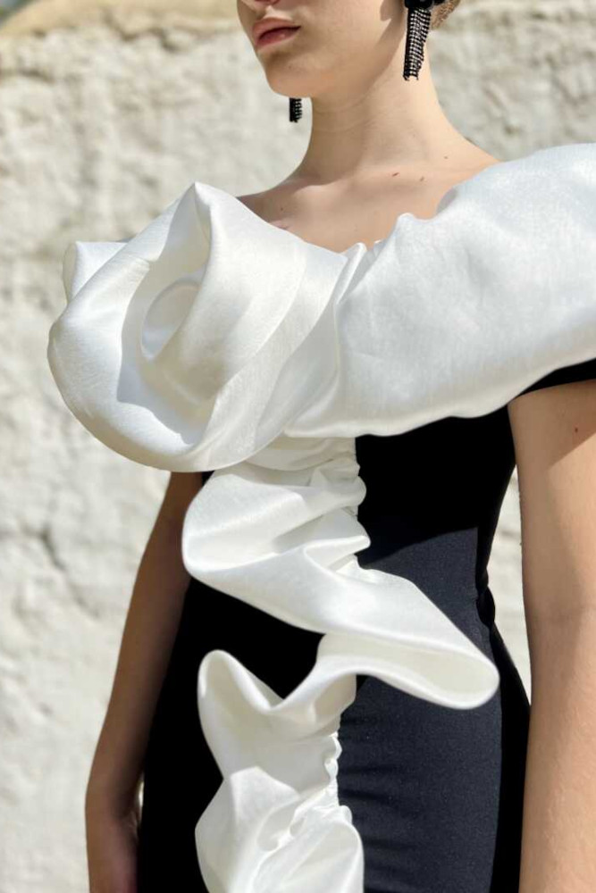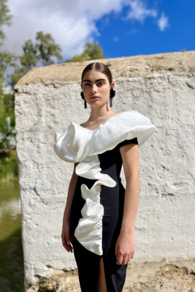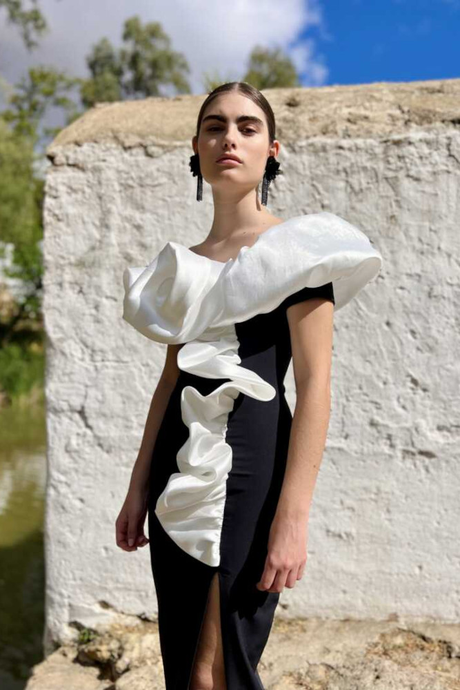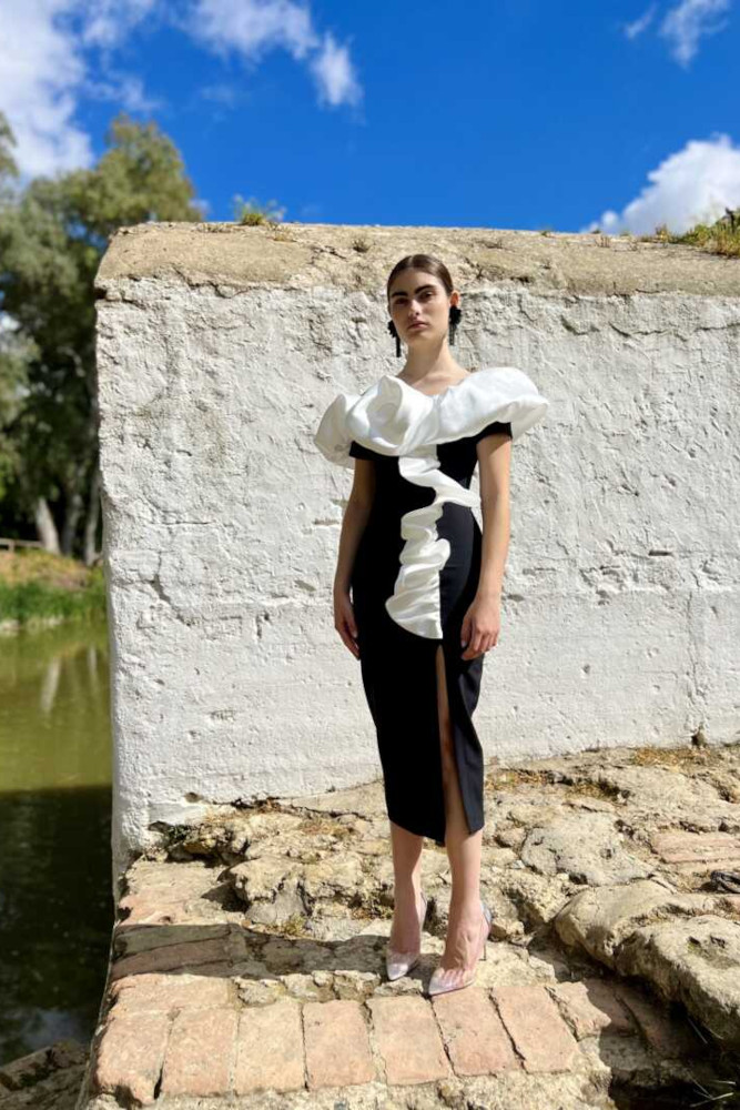 Vestido en tejido bielástico con manga a la sisa y detalle de volante y flor en tafetán. Lleva forro interior. Nuestro vestido midi va cerrado con una cremallera trasera invisible para su mejor colocación.