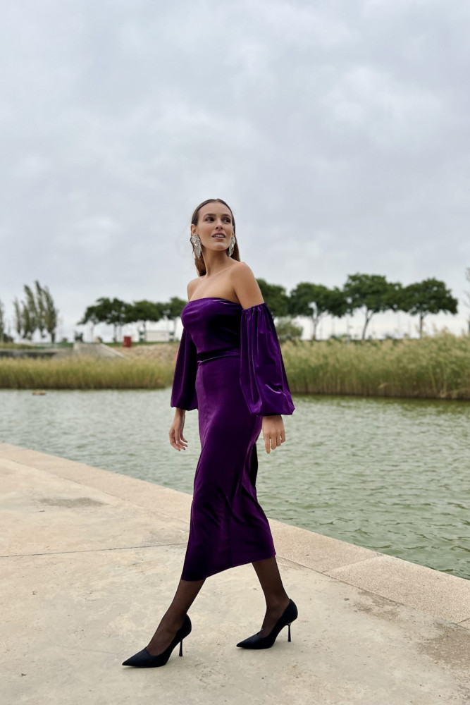 Nuestro vestido de fiesta tiene un corte midi, estrecho y con una abertura al frente que facilita el paso al caminar. Está confeccionado en un tejido terciopelo que no necesita forro interior ya que no transparenta nada. Este vestido de invitada tiene las mangas abullonadas. A cada lado del cuerpo tiene unas aberturas que están muy de moda y que nos encantan porque le aporta un toque original y juvenil. El puño de la manguita de nuestro vestido midi va fruncido para que quede ajustado a tu brazo si prefieres ponerte la manguita más corta, además, tiene hombreras para que tu figura quede más marcada.