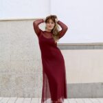 Con cuello redondo y tul liso en color burdeos, el vestido se alarga en corte midi aportando movimiento y personalidad.